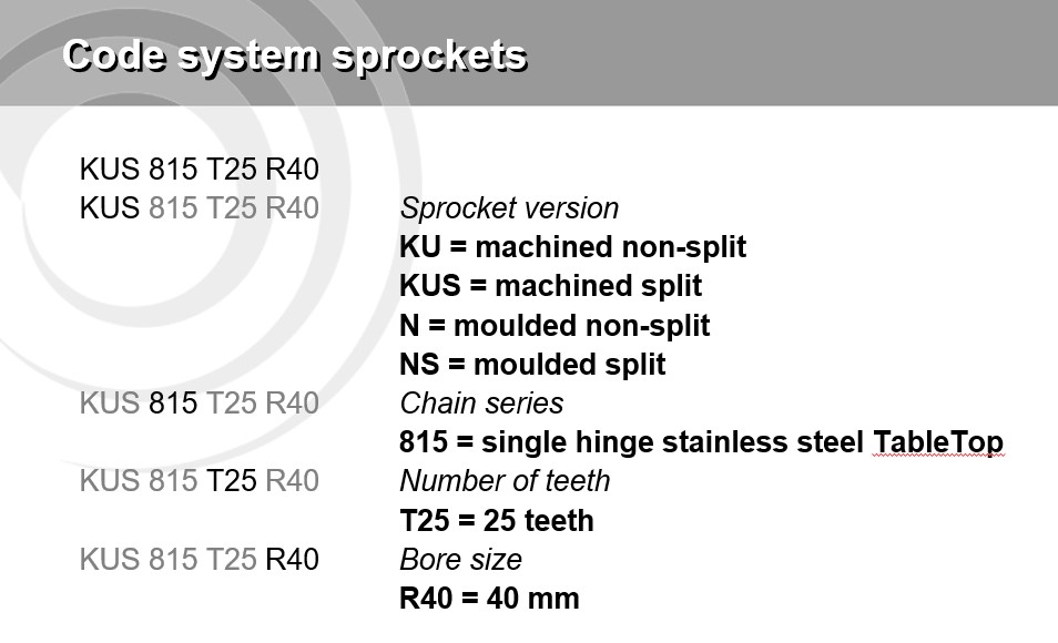 Sprocket is the drive of the motor conveyor. place at the motor for pulling the conveyor chain. Each Table Top Chain and Modular chain has different type of sprocket.